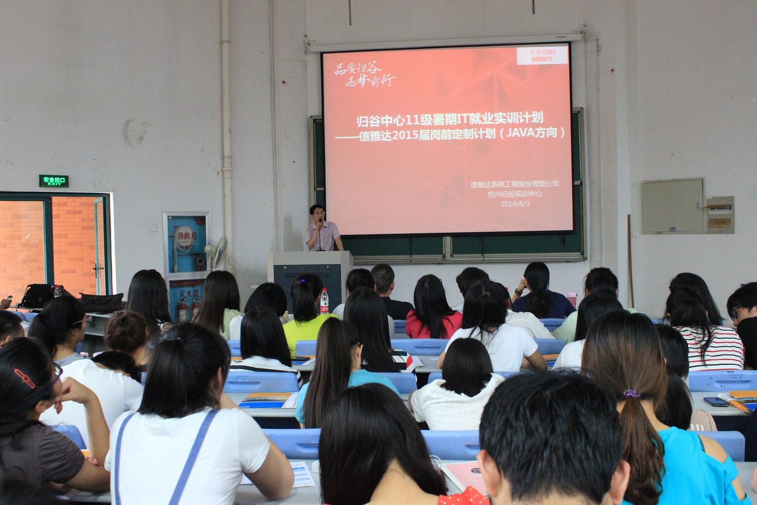 姚经理发言结束后,四家企业代表分别上台发言。首先,浙大网新市场部周迪通过视频简单介绍了网新的企业文化及基本情况,强调了其软件服务外包在同行中的优越性。随后,周老师详细介绍了网新为毕业生所提供的优质实训项目,并竭诚邀请公司员工到其公司参观、实训。接着,归谷中心的叶主任介绍了归谷中心2011级暑期IT就业实训计划——信雅达2015届岗前定位计划的具体内容,极大地吸引了对金融软件开发以及金融服务方面感兴趣的同学。叶主任也代表归谷中心,邀请公司2011级毕业生加入他们的团队。然后,同花顺公司的王鹏用其幽默诙谐的方式与员工们分享了其自身的经历,提醒员工放下懒惰,从现在做起,好好规划自己的人生。随后,王鹏详细地介绍了这个于2009年成功登陆创业板,成为首家中国互联网金融信息服务的优秀企业。最后,聚宝盆电子商务有限公司相关负责人向员工介绍了公司情况及相关业务,重点展示了电子商务进万村平台。聚宝盆作为国内电子商务服务的领导者,希望员工通过实训提升运用电子商务的能力,鼓励员工自主创业。同时通过分享其他老员工创业的经历,进一步激发了公司员工创业的热情。