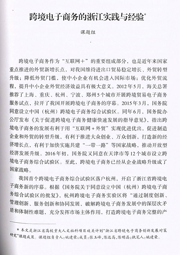 近日,由公司信息分院教授姚建荣负责并主笔的《跨境电子商务的浙江实践与经验》经过专家评审,在300余篇论文中脱颖而出,入选中共浙江省委宣传部汇编的《“四个全面”战略布局和“八八战略”研究》一书。该书是2015年度中国特色社会主义理论体系研究中心重大项目和国家社科基金重大项目成果。论文《跨境电子商务的浙江实践与经验》是浙江省高校重大人文社科项目攻关计划“浙江省跨境电子商务创新发展对策研究”课题成果。