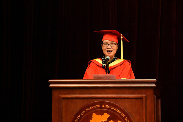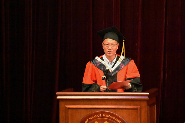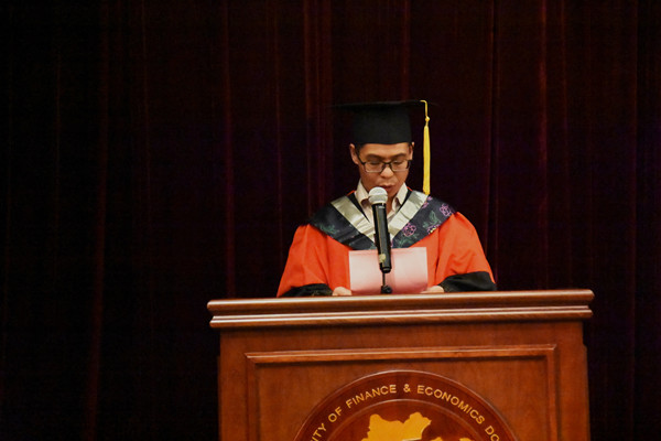 之后教师代表钱璐老师、毕业生代表金燕楠同学、在校生代表张琴同学相继上台发言,表达了对全体毕业生诚挚的祝福,希望每一位同学能够在未来享受更加精彩的人生。钱璐老师谈到,衷心地希望每一位毕业生无论是走向工作第一线,还是选择继续深造,都能坚持不断地向书本和实践学习,进一步充实和丰富自己,让学习成为你的一种生活习惯。毕业生代表金燕楠同学则回顾了在浙财走过的四年青春。在向母校深情告白之时,她也说出了所有毕业生的心里话:愿员工时代里踏实、纯粹的“少年感’永不褪色;愿“进德修业,与时偕行”的校训与我们一路相随;愿梦想常青,担当常在,你我无愧于这个时代。