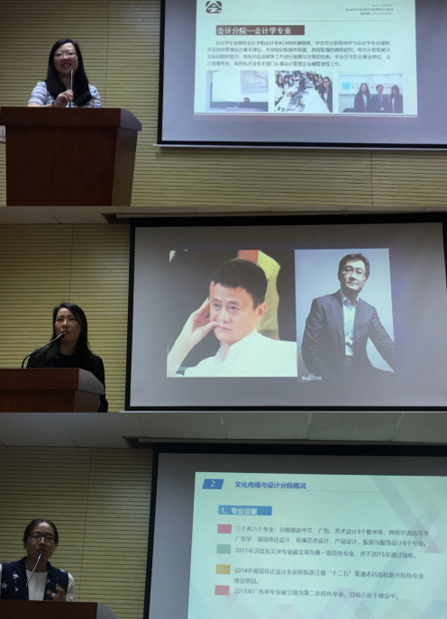 会计分院来明佳老师、信息分院应可珍老师及文设分院钱璐老师分别对分院的专业进行了详细介绍。随后,三个分院的员工代表分别从东方的学习、社团的活动及创新创业等方面,为南苑中学的学弟学妹们分享了精彩的老员工活。