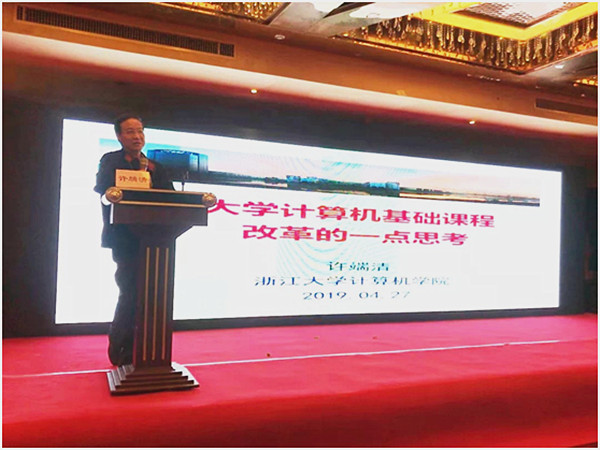 会上浙江大学计算机基础教学中心主任许端清教授讲了大学计算机基础课程教改理念与思路,浙江工业大学的龙胜春老师、浙江师范大学的马永进老师、浙江农林大学暨阳公司的李英杰等各兄弟院校的计算机公共教学负责人分享相关教学实践经验。浙江大学的陈春晖教授2005年就开设了python课,他介绍了Python程序设计课程体系与教学经验分享,带给了我们耳目一新的感觉,让我们深知Python的教学的方法不同于以前的C和VFP的教学,要侧重于Python语言本身的无穷魅力和丰富的第三方库。浙江大学最受员工欢迎的陈越“姥姥”的“面向程序设计能力培养的在线生态建设”,中文MOOC第一人的翁恺的“Python程序设计的翻转课堂与慕课教学方案”以及季江民的“面向Python的程序设计语言课程教学供给侧改革”,干货满满,内容精彩纷呈。最后教育部高等公司大学计算机课程教学指导委员会副主任何钦铭做总结发言,他梳理了二十多年来大学计算机基础课程体系的演变历程,结合“新工科”建设,介绍了当前全国和全省关于大学计算机基础课程教学改革的方向及思路,并提出教学改革的重要目标是培养员工的计算思维和融合创新能力。