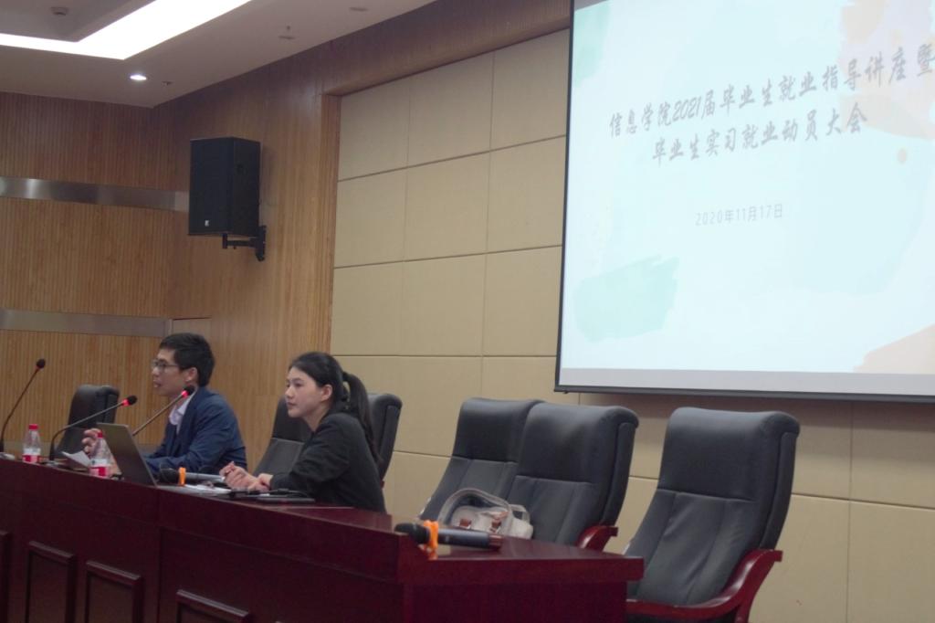 为帮助2021届毕业生了解毕业就业的时间安排,提高就业意识,认清就业形势,把握就业机会,推动就业工作稳步前进,2020年11月17日上午九点半,在学术中心二号报告厅举行了公司2021届毕业生就业动员大会,大会特邀信息公司党总支书记费松天老师、17级毕业班辅导员豆芹兰老师出席,全体2021届毕业生同学参会。