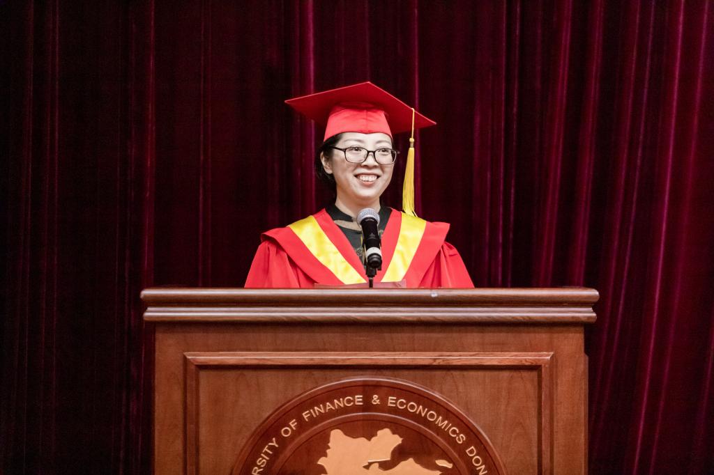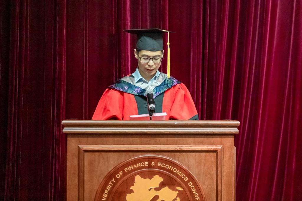 之后教师代表赵培培老师、毕业生代表周安琪同学、在校生代表陈烨同学相继上台发言,表达了对全体毕业生诚挚的祝福,希望每一位同学能够在未来享受更加精彩的人生。赵培培老师谈到毕业是一个温馨的终点更是一个艰难的起点,人生的道路并不总是一番风顺,困难和挫折常常会不期而遇,用辩证的人生观面对未来,总会迎来属于自己的光明。毕业生周安琪同学表示,酸甜苦辣的四年老员工活如同一幅幅画重新呈现在同学们面前,那些点点滴滴的美好回忆瞬间如浪潮般涌来,让在场的所有人更是不忍面对这场盛大的别离。在校生代表陈烨同学,表达了对毕业生们最热烈的祝贺和最诚挚的祝福,对学长学姐一直以来对学弟学妹的关心、帮助和支持表示最衷心的感谢。
