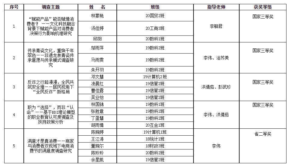 数据科学、应用统计、计算机、财政、信息管理员工陈婉婷、董婉尔、王江涛、余星凯、陈玲玲完成的调查报告《满意才是真消费——商家与消费者双视域下电商消费节的满意度调查研究》获得省二等奖。
