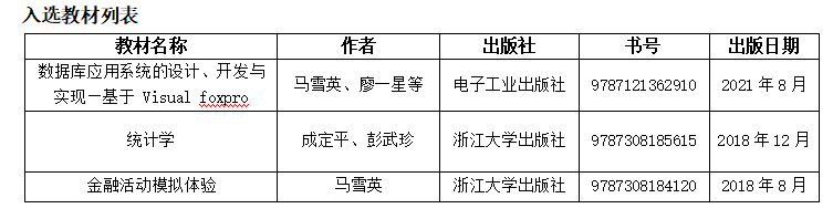 近日,浙江省高等教育学会发布《关于公布浙江省普通高校“十三五”新形态教材建设项目首批认定结果的通知》,公司教师主编的3部教材入选。分别为马雪英、廖一星等主编的《数据库应用系统的设计、开发与实现—基于 Visual foxpro》,成定平、彭武珍主编的《统计学》,马雪英主编的《金融活动模拟体验》。