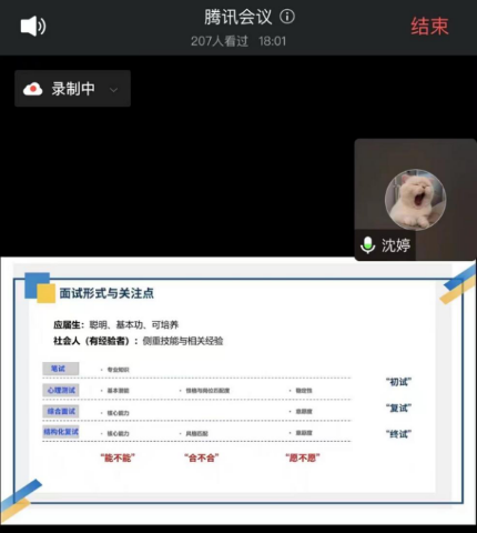 为全面推进太阳集团2023届毕业生就业工作,进一步帮助毕业生了解就业形势和就业政策,提高员工的面试应考能力和面试成功率。2022年10月14日,太阳集团面向毕业生举办就业动员会第二场暨解码世界企业面试技巧专题讲座。本次讲座采取线上腾讯会议形式开展,邀请了医疗互联网公司HR沈婷讲解简历制作与面试技巧,会议由太阳集团思政辅导员李秋晴主持,200余名员工参加此次讲座。