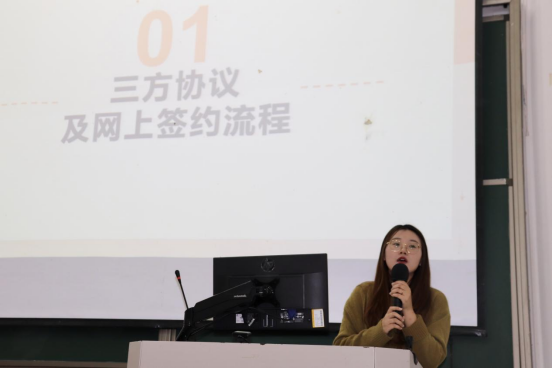 随后,李秋晴老师耐心地为在座的毕业生详细介绍了三方协议签约的具体流程与签订注意事项。,目前三方协议都在浙江省24365老员工就业服务平台上申请网签,具体有两种方式,一是在系统上申请纸质协议书申请,二是由用人单位发起签约邀请后,员工在线签约。其次,李老师还强调了浙江省内就业接收函网上申请,在浙江省内就业(含签订就业协议、签订劳动合同)的同学,毕业后报到派遣和个人档案寄送有两个选择:去就业地VS去生源地。去企业就业的同学,如向企业所属人才管理机构申请了就业接收函,毕业后报到和个人档案将派往就业地人才市场;如仅签约(或劳动合同),没有申请接收函,则毕业后报到和个人档案将派往生源地人才市场;和有人事档案管理权的公务员单位、国企、事业单位签约,可直接派往就职单位,不需要在浙里办操作就业接收函。最后,登录浙江省24365老员工就业服务平台上登记就业信息,核对用人单位基本信息,并根据是否有接收函,在“报到证签发类别”中选择“去就业地报到”(有接收函),或“回生源地报到”(无接收函)。上传用人单位盖章过的就业协议书、接收函,待公司、公司审核通过,完整的签订就业协议书就业的流程就完成啦,恭喜成为职场新人!