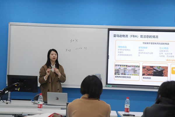 培训分两部分内容。首先由张玉峰围绕海宁市跨境电子商务产业定位和主要工作、跨境电商发展情况、跨境电商聚集区、跨境电商扶持政策和跨境电商发展规划5个方面向大家介绍海宁市跨境电子商务产业带的基本情况,让大家进一步熟悉海宁市迅速发展的跨境电子商务产业和政府的具体工作导向。杨盈女士从亚马逊全球开店的“时代青年计划”出发开展第二部分的内容培训。她从亚马逊整体介绍、详情页制作、亚马逊物流和广告和推广等四个部分详细地向老师们介绍亚马逊平台概况及其基本操作,帮助教师进一步提升跨境电子商务的知识和技能,深入理解亚马逊平台及其主要运营规则和技巧。培训结束后,培训人员进行了合影留念。