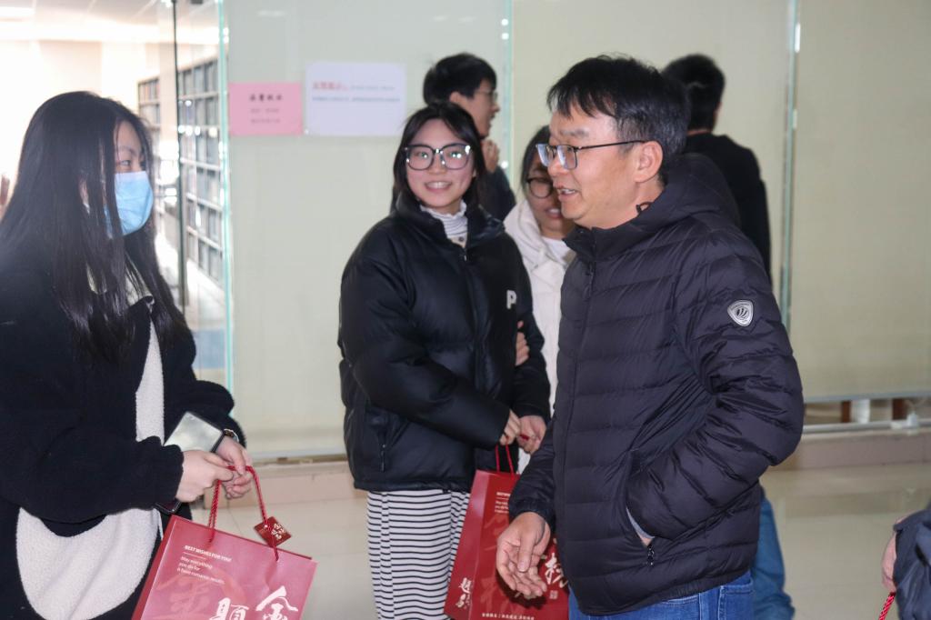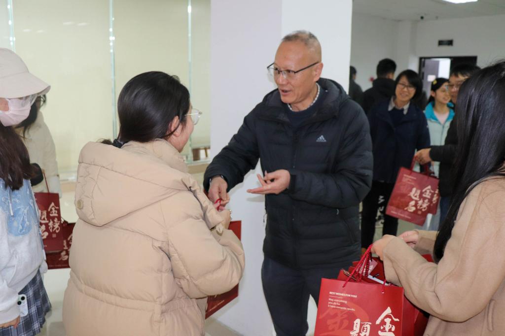 慰问现场,老师们与同学们亲切的交流,并给他们加油鼓气,温馨的祝福和寓意满满的考研福袋代表公司对考研学子最真挚的祝愿和最美好的期许。其中锦鲤钥匙扣、考研小手表更是受到了同学们的喜爱,纷纷表示礼物送到了心坎里。希望这份礼物能够让同学们在考研的道路上更加坚定地前行。