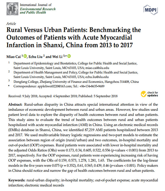 9月,李伟教师再次以通讯作者在《International Journal of Environmental Research and Public Health》上发表论文《Rural Versus Urban Patients:Benchmarking the Outcomes of Patients With Acute Myocardial Infarction in Shanxi,China from 2013-2017》,论述农村与城镇急性心肌梗塞患者在院死亡率和付现费用的差异。该刊是公共卫生方面权威期刊之一,2017年JCR影响因子为2.145,SSCI版PUBULIC,ENVIRONMENT & OCCUPATION HEALTH类别中排序44/156,JCR分区为Q2。