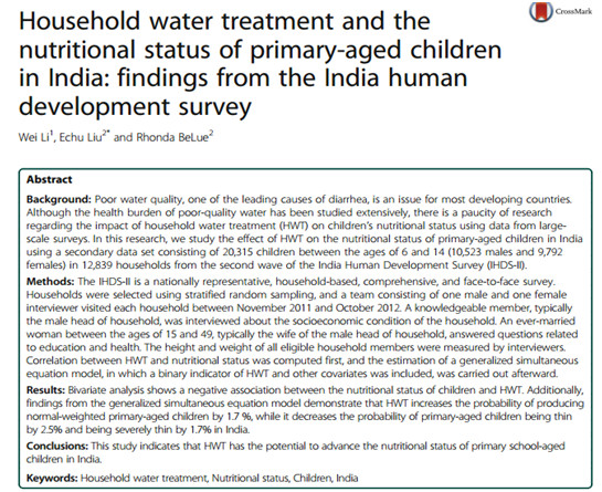 2018年4月,李伟教师以第一作者在《Globalization and Health》上发表论文《Household water treatment and the nutritional status of primary-aged children in India:findings from the India human development survey》,论述家庭用水处理方式与儿童营养状况间的关系。该刊是公共卫生方面权威期刊之一,2017年JCR影响因子为3.031,5年JCR影响因子为3.17,SSCI版PUBULIC,ENVIRONMENT & OCCUPATION HEALTH类别中排序13/157,JCR分区为Q1。