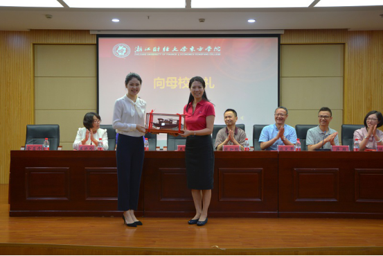 嘉兴员工会会长金益丹代表员工会向母校献礼--红船模型,红船起航,梦想起飞,红船是中国共产党登上历史舞台的起点。寓意着我们东方学子们应进一步学习弘扬“红船精神”,努力当好“红船精神”的忠实守护者、坚定传承者和自觉践行者。