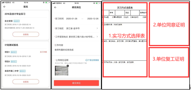实习方式中(3),需拍照上传《实习方式选择表》、加盖公章的《单位同意证明》和《单位复工证明》,将这三张照片拼在一起上传。