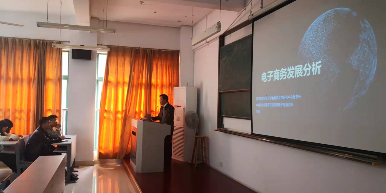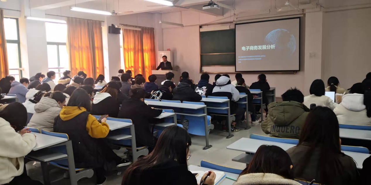 接着,李源老师分析了我国电子商务发展趋势。李老师认为,当前的电子商务行业总体呈现出革新快、迭代迅速的特点。他提醒同学们,电子商务不只是公司教学体系里的那些知识,也不只是手机屏幕上看到的那些亮点,以当前直播电商为例,除了台前的直播人员,行业还有屏幕之外对于编导演、包装设计、物流等专业人才的巨量需求。他以各大主流电商平台的崛起、头部直播电商主体的方兴未艾为案例,启发同学们尽早通过实践去体验什么是电子商务,勉励同学们早定位、早规划,尽早掌握行业发展规律,尽早享受行业发展红利。