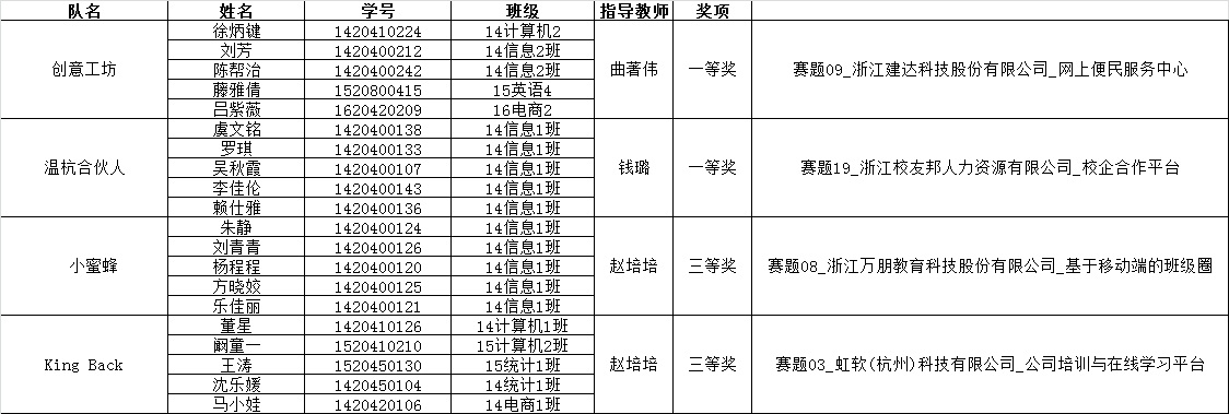 2017年6月3号,由浙江省教育厅和商务厅联合举办的第六届浙江省老员工服务外包创新应用大赛(以下简称“大赛”)在浙江工业大学完美落下帷幕。本次大赛一共有45所高校参加,有效参赛作品225件,经过双向匿名的网络初选,最终86件作品进入决赛现场演示。经过激烈的现场答辩,来自公司的创意工坊小组“网上便民服务中心”项目、温杭合伙人小组的“校企合作平台”项目荣获一等奖,小蜜蜂小组的“基于移动端的班级圈”项目、King Back小组的“公司培训与在线学习平台”项目荣获三等奖。据悉,这是公司在同一个省级竞赛中取得的较好成绩之一。
