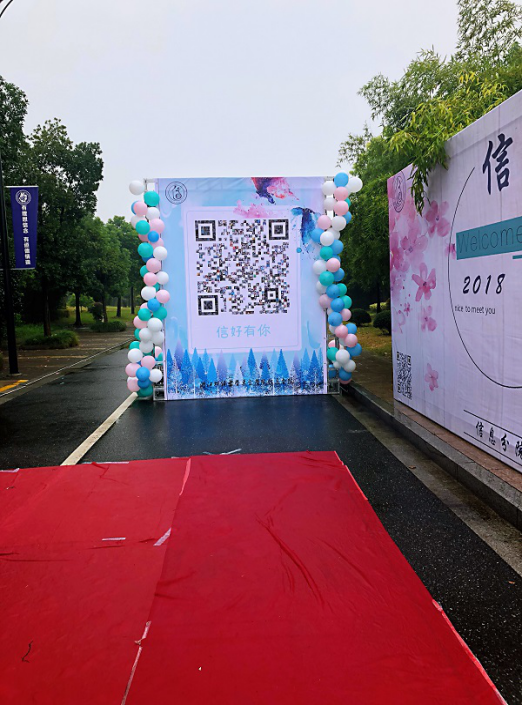 2018年9月7日,为了迎接新世纪的新生宝宝们的到来,分院在三号实验楼门口摆放着两幅大型喷绘,其中一幅是由新生照片制作而成的二维码,通过微信扫一扫可以关注信息分院的公众号,不仅突出了信息分院专业特色,也象征2018级新生成为信息分院新的一份子。