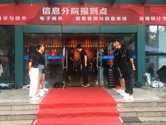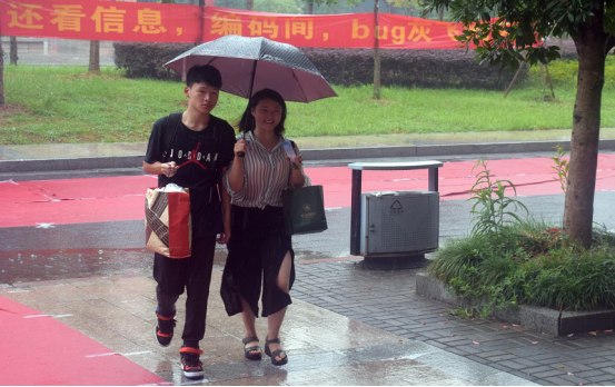 大雨也浇不灭志愿者们的热情,志愿者们早早来到了三号实验楼列队等候着,只为新生的到来。不管风大雨大,每当有新生来报到时,他们总能热情地上去迎接。在办理好入学手续后将他们送到寝室,替新生和家长分担重量,家长们十分欣喜。