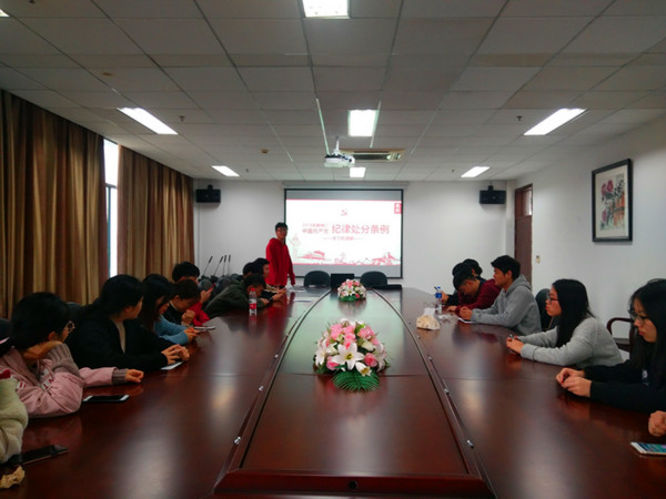 为了进一步的提高员工党员干部自觉遵规守纪的党员思想意识,加强员工党员队伍的纪律建设,强化党员的责任意识和组织凝聚力,信息分院员工第一党支部组织全体员工党员于11月21日下午,开展组织了以“贯彻学习党纪党规 争做合格优秀党员”为主题的学习《中国共产党纪律处分条例(2018年修订版)》的党日活动,会议由员工第一党支部书记包轶老师主持,员工第一党支部全体党员参与学习讨论。
