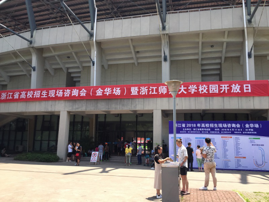 2018年浙江省高校招生现场咨询会(金华场)在浙师大东田径场举行。本次招生咨询会有来自全国各地的公司,有985、211高校,也有一般本科、独立民办、高职院校等。早上7点40 左右,参加咨询会的应芳琴、徐朝晖老师早早就来到会场,摆好资料做好准备。